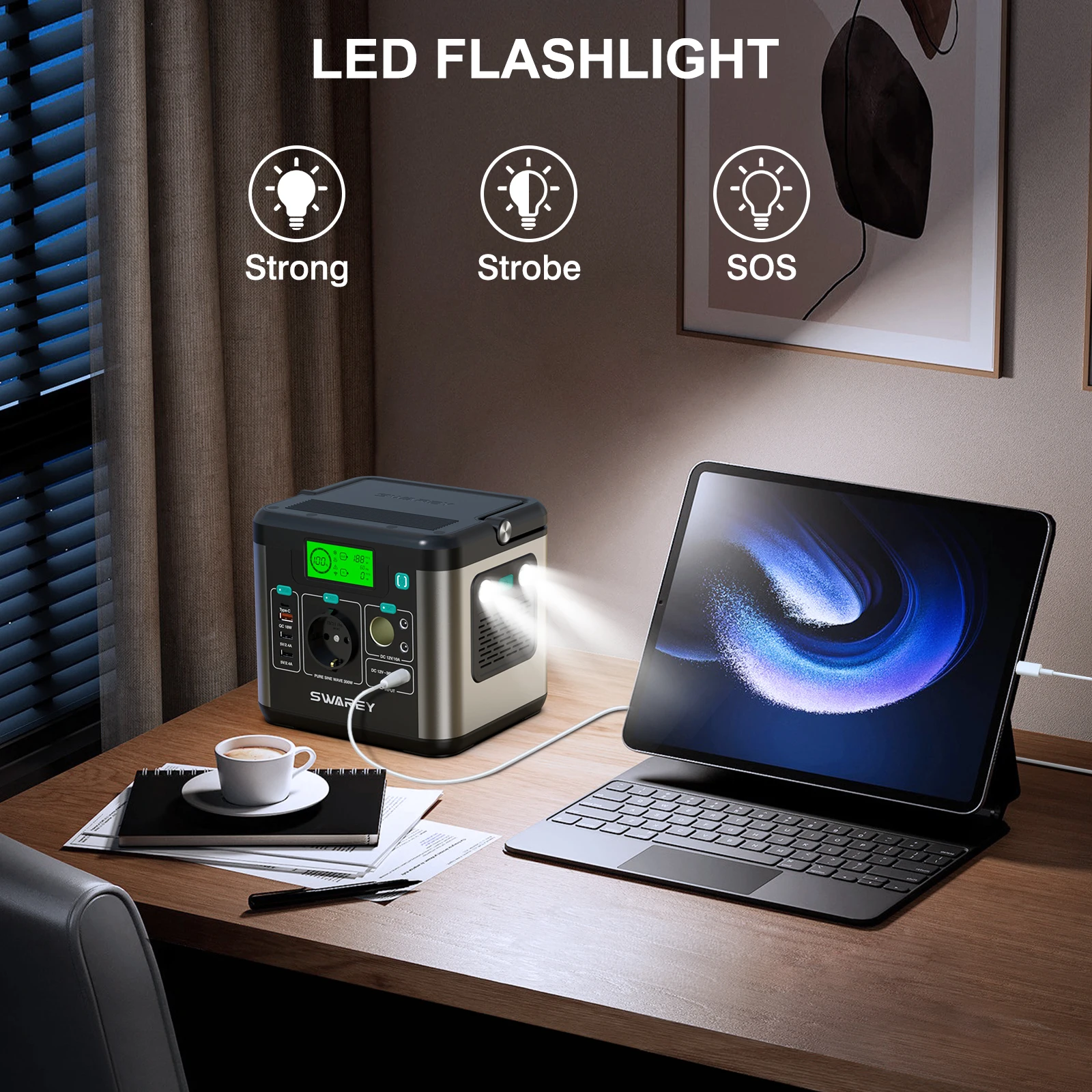 SWAREY 300W Portable Power Station with Pure Sine Wave 300W (Peak 600W) AC Outlet and PD 65W USB-C Port for Camping, Fishing