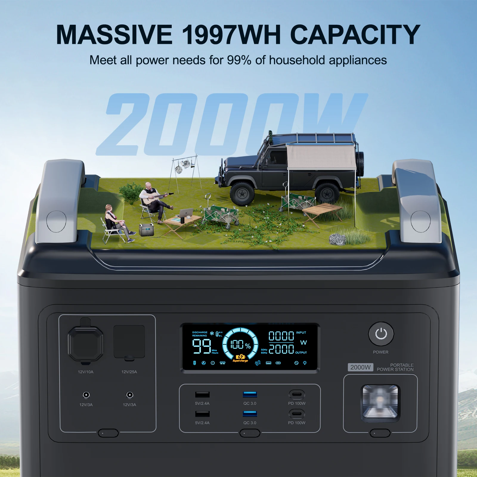 【2000W HIGH POWER FOR ANYTHING】High-power 2000W(peak 4000W) VDL LiFePO4 backup energy station will allow you to power any home appliances, kitchen appliances, electronics, tools, outdoor products in any situation.Besides, the VDL HS2000 power station has a large capacity of 19970Wh, power can last 2 days trip!