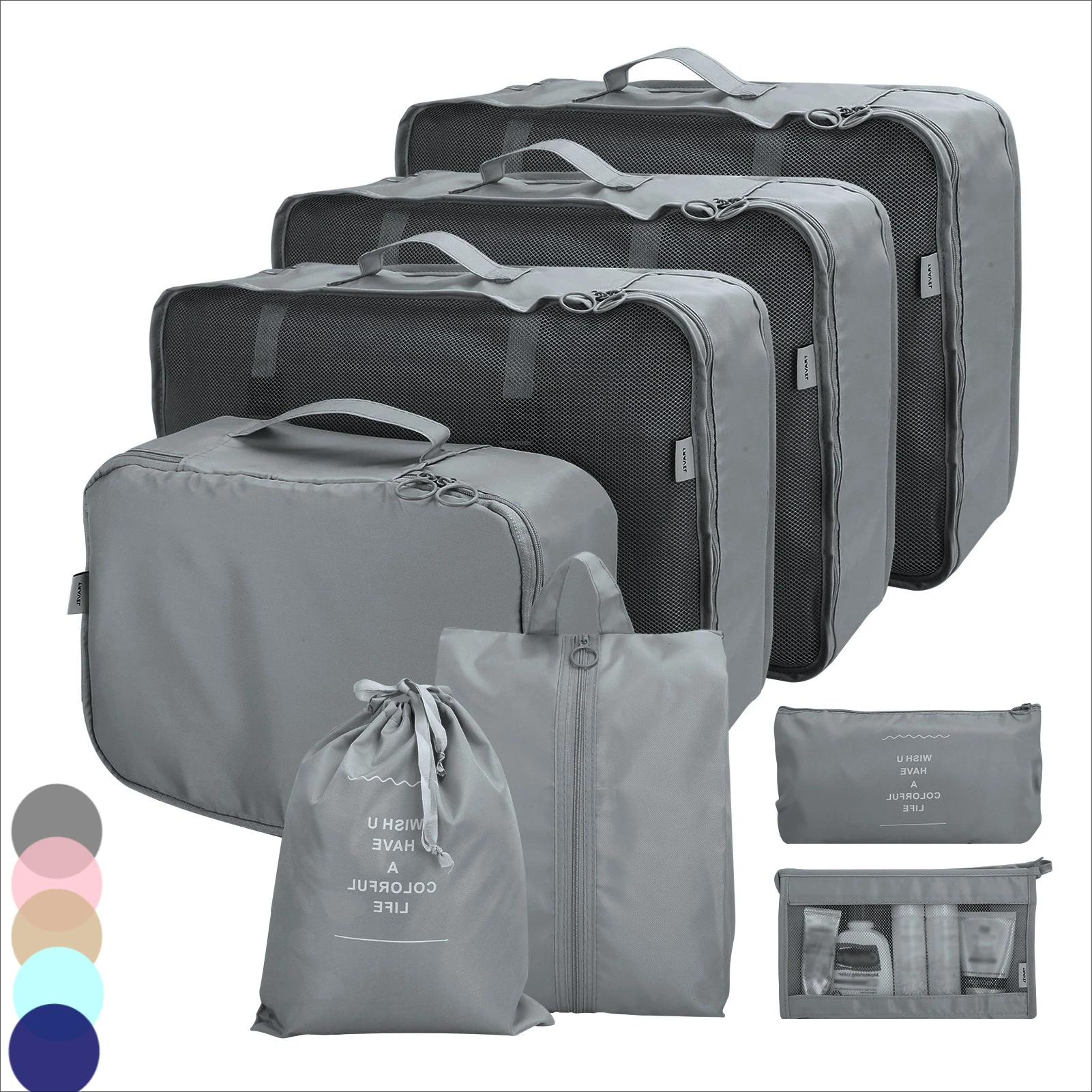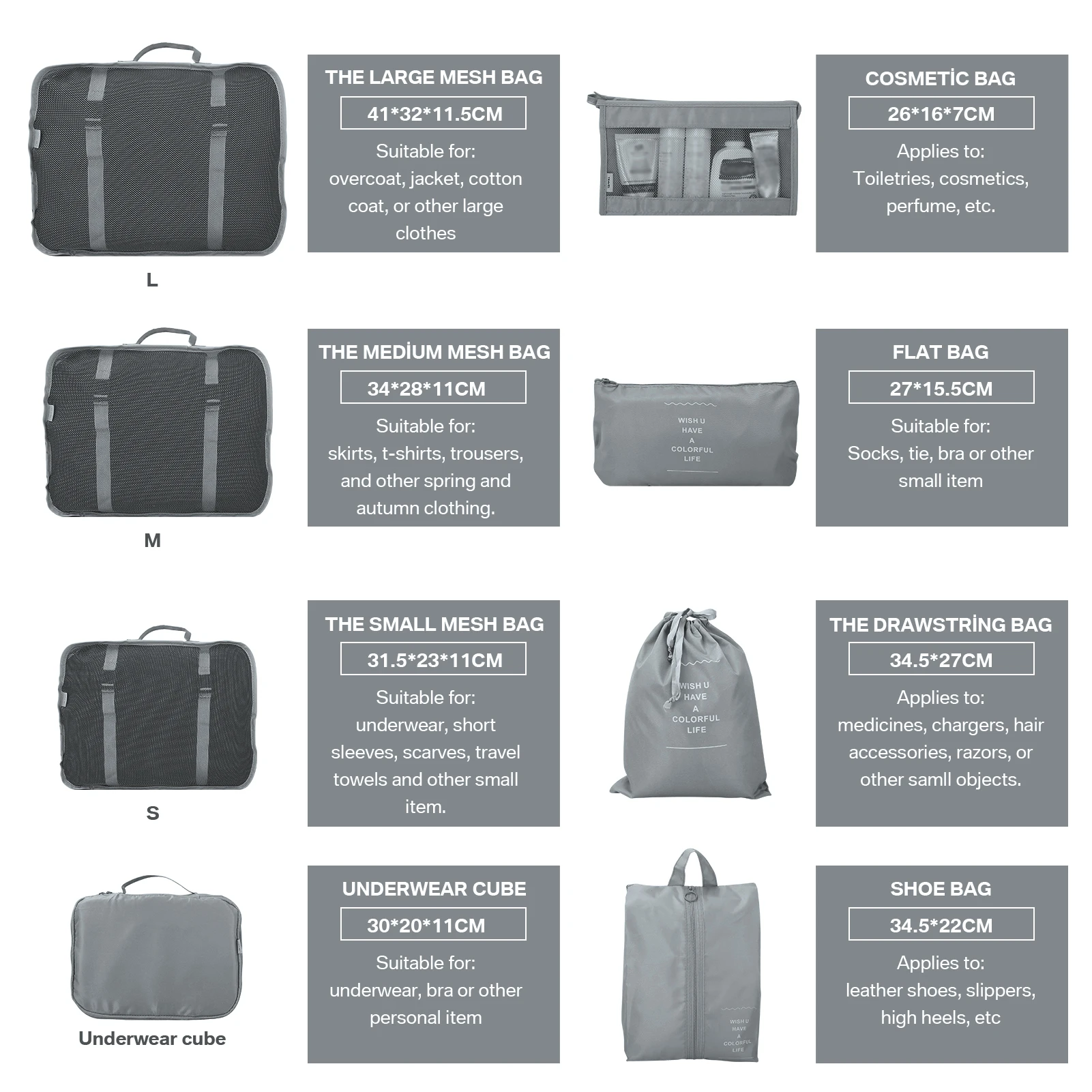 SUPER VALUE TRAVEL BAGS SET: Include 3 single travel cubes for clothes, 1 cube for underwear, 1 drawstring bags for dirty laundry and cosmetic, 1 make up bag for cosmetic and toiletries, 1 shoes bag for shoes, 1 small bags for socks, coins, pens, keys etc. They can make your luggage neat and order, make you have a easy, comfortable travel experience.
